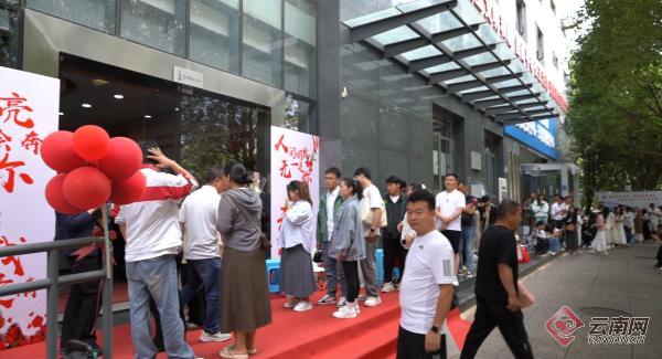 当天一大早,官渡区政务服务中心外早已排起百米“幸福长龙”。工作人员忙碌有序地为新人发放排队号,引导他们分批进入办理区域。在二楼婚姻登记处,不少新人身着婚纱、手捧鲜花,在多个登记窗口前耐心等待,现场洋溢着甜蜜温馨的氛围。