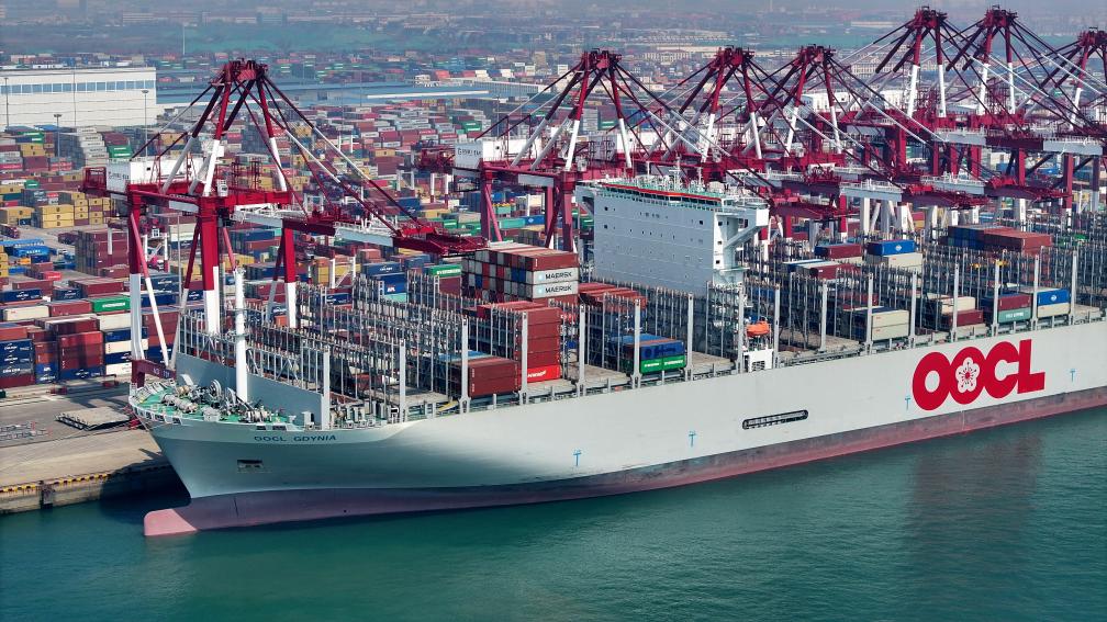 4月10日,一艘集装箱货轮在山东港口青岛港前湾集装箱码头进行装卸作业(无人机照片)。新华社记者 李紫恒 摄