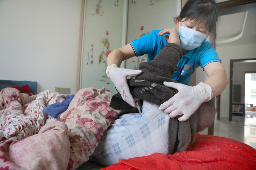 4月29日,王汝芳为服务对象江爷爷换衣服。新华社发(许丛军 摄)