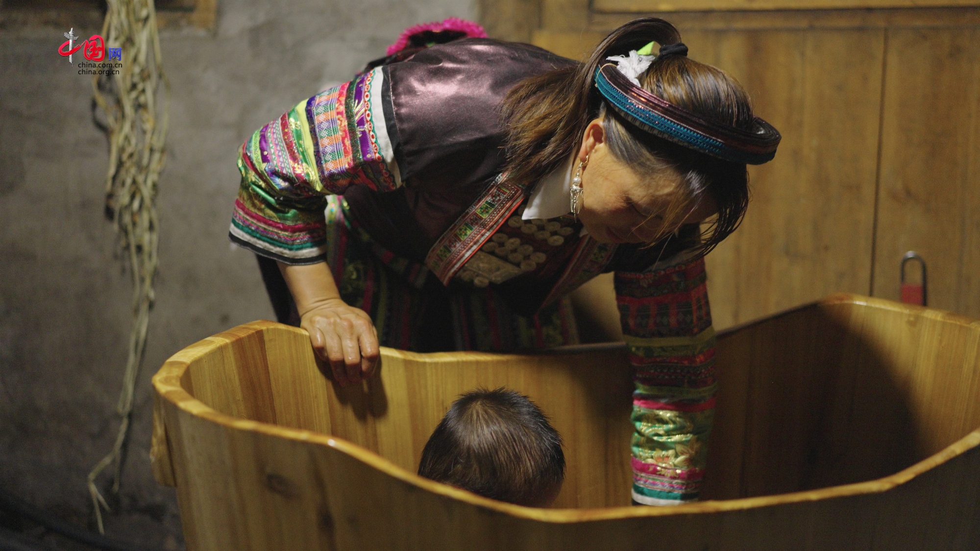 Zhao Youhui: In our Yao family, the primary use of Yao medicated bath is for women during childbirth. When a woman is about to give birth, her father-in-law and mother-in-law would go to the mountains to collect herbs and bring them home to dry them by hanging them upstairs. If the woman experiences abdominal pain, the father-in-law would immediately start a fire and pour water into a large tub. After childbirth, the woman would then be called to soak in the tub, and water would be scooped to bathe the newborn in a basin. This helps prevent diseases in the child. After the woman takes a medicated bath, her body would recover quickly, and within three days, she can resume doing some household chores and certain work at home.
