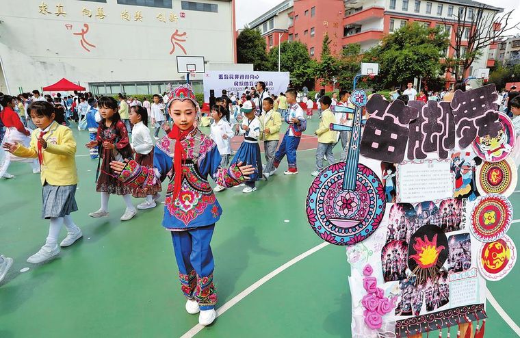 5月20日,官渡区东站实验学校举办以“五育花开籽籽同心,民族体育悦动课间”为主题的第六届“蓝花楹”艺术节。霸王鞭、踩高跷、舞狮、滚铁环、板鞋竞速、猜谜语、打跳……40余个民族文化体育项目吸引了大量师生参与体验。图为校园课间游戏创意集市上,穿着民族服装的孩子们欢乐打跳。 云南日报记者 杨峥 摄
