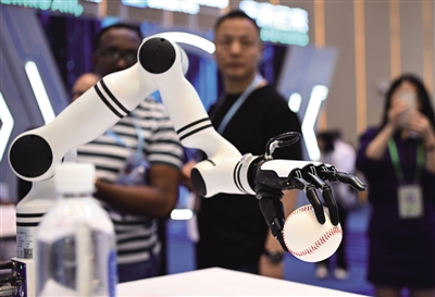 一台机械臂正在展示灵巧手功能。 (新华社记者 邓华/摄)