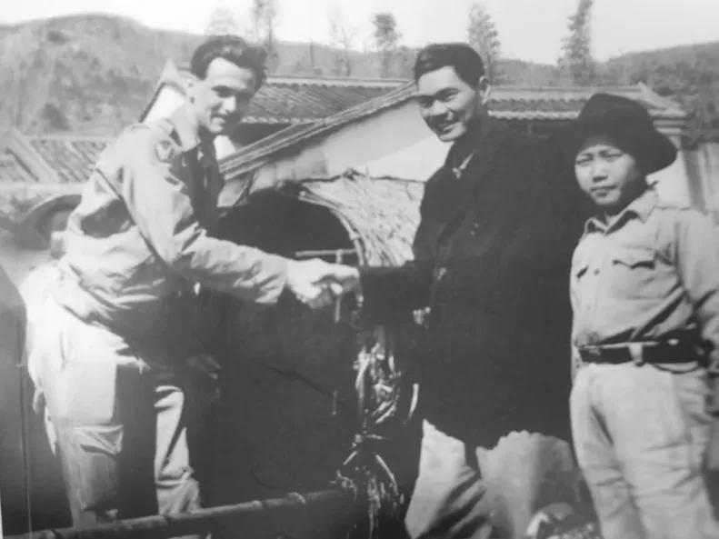 这张合影拍摄于1944年的深圳坪山。画面最左边,梳着背头、穿着飞行夹克的帅气小伙,是美国“飞虎队”飞行员克尔。与他握手的人,是活跃于华南抗日战场上的东江纵队司令员曾生。