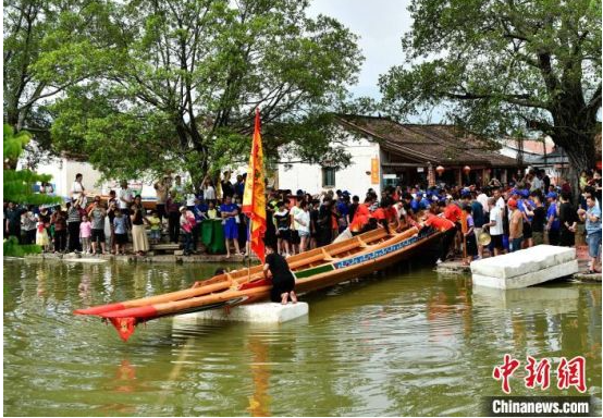 5月10日上午,漳州市龙海区埭美村为吴福来新造的3条龙舟举行吉水仪式,图为当地村民们将其中一条新龙舟推入水中。中新网记者 张斌 摄
