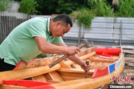 5月10日下午,福建漳州龙舟钉造技艺第五代传承人吴福来正在制作新的龙舟。中新网记者 张斌 摄