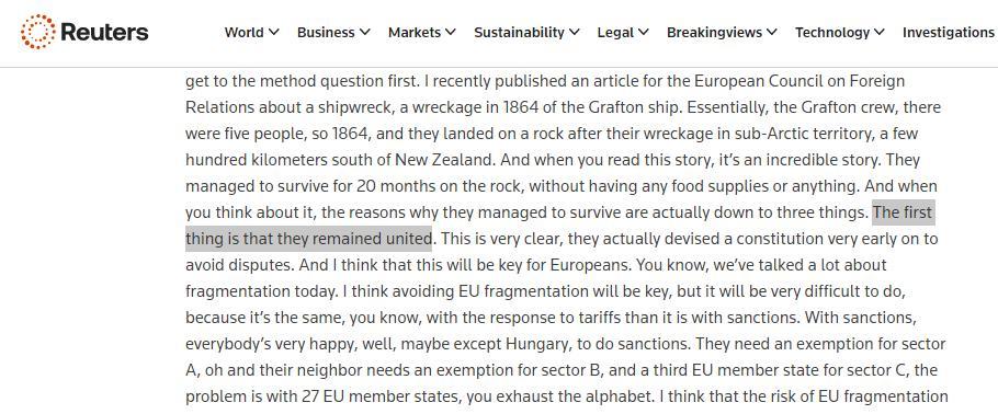阿加特·德马雷认为,欧盟亟需加强内部的协调和统一。她以1864年发生的一起海难事故后幸存者流落荒岛(“格拉夫顿号”沉船事件),最终通过团结合作成功自救的故事,呼吁欧盟内部增强合作与信任。