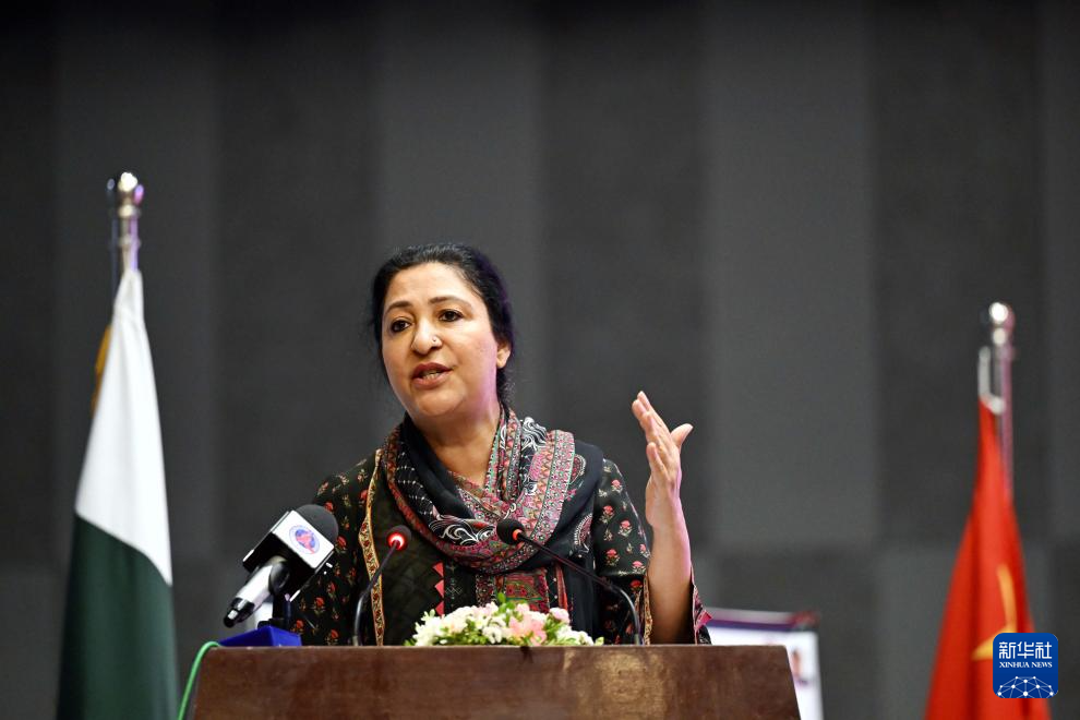 5月27日,巴基斯坦联邦教育与职业培训部国务部长瓦姬哈·卡马尔在伊斯兰堡举行的中资企业高校毕业生招聘会上致辞。新华社发(艾哈迈德·卡迈勒摄)