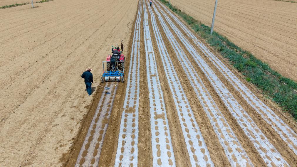 此次人工增雨作业后,受旱较重的庆阳市环县曲子镇五里桥村的田间地头,呈现一片抢墒播种的景象。村民们开着覆膜机,为浸润过雨水的土壤覆上一层地膜,然后将玉米、大豆等作物种子点播下地。