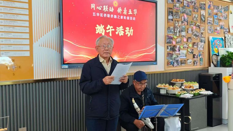 端午读书会现场,墨香与粽香交织。朗读者深情诵读汪曾祺《昆明的雨》、老舍《滇行短记》等描绘昆明风物的经典篇章,字字句句流淌着对春城的眷恋。南侨机工后人曾氏三兄弟登台,以家族故事为轴,动情讲述先辈在滇缅公路上舍生忘死运送抗战物资的壮举,一曲《我和我的祖国》更是唱出了侨胞炽热的赤子之心。郭明忠、赵家凤等侨界文艺爱好者随后献上民歌演唱,将家国情怀融入艺术,现场气氛推向高潮。昆明市侨联、市委统战部及五华区侨联特地为侨胞代表送上吉祥香包,传递端午安康祝福。