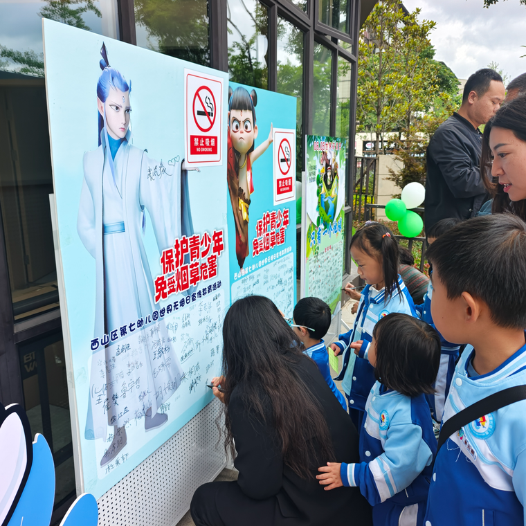 本次活动由园方统筹策划,大、中、小班幼儿分时段参与,教职工、家长志愿者共同参与,同时考虑到天气原因,采用了“室内+室外”相结合的方式,确保各环节安全有序。活动这一天,家长和孩子们早早来到幼儿园,孩子们在“世界环境日”“世界无烟日”的倡议板和“西山区第七幼儿园环保宣传倡议书”上签上自己的名字。