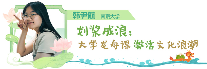 赛龙舟作为端午的传统习俗,水上竞渡、锣鼓齐鸣是人们翘首以盼的热闹景象。从最初的纪念屈原、祛灾辟邪的传统习俗,到如今龙舟划进大学课堂,赛龙舟已经不仅仅是一项端午民俗,更是一项活态非物质文化遗产。通过真实互动与情感共鸣,在“代际传递” 与 “沉浸体验”中,传统文化基因在时代浪潮中激荡出生生不息的青春回响。