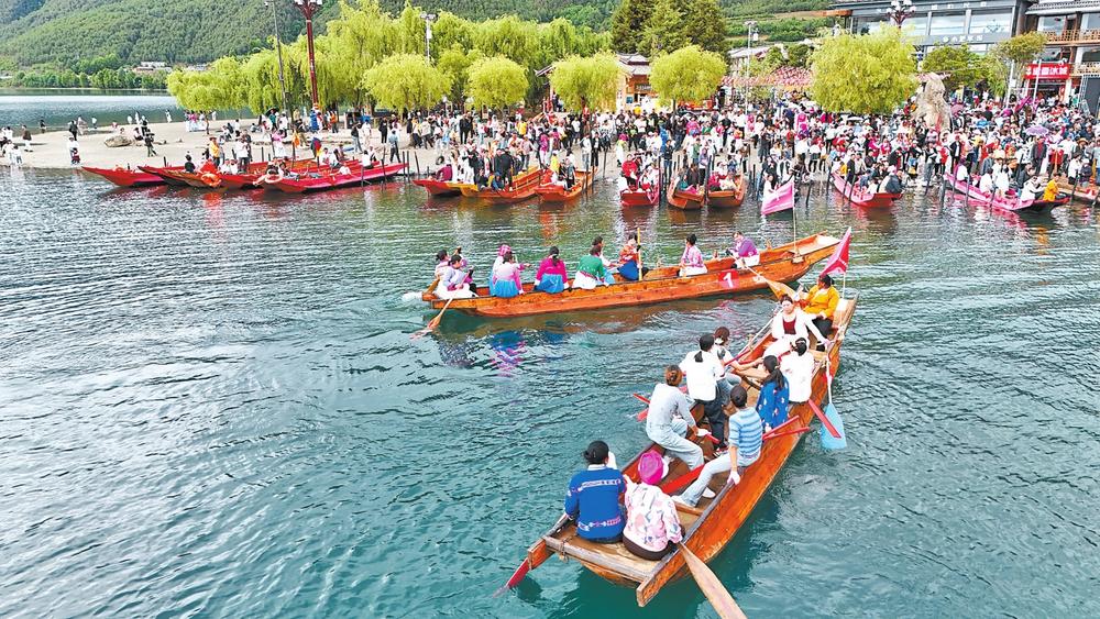 端午假期,丽江泸沽湖景区大落水村的游船停靠点热闹非凡,川滇各村组群众身着盛装齐聚,共同开展摩梭传统猪槽船大赛系列活动。