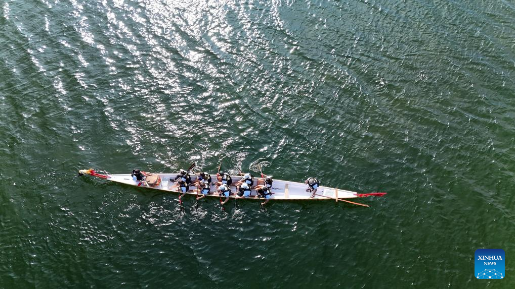 An aerial drone photo taken on June 1, 2025 shows a canoe kayak team at the 1st "Dragon Boat Race - Friendship Cup China-Greece: The Silk Road Meets the Aegean Sea" in Athens, Greece. Hundreds of spectators gathered at the Olympic Rowing Center in Schinias, northeast of Athens, on Sunday to witness a vibrant dragon boat race held in celebration of the Dragon Boat Festival and the deepening ties between China and Greece. (Xinhua/Marios Lolos)