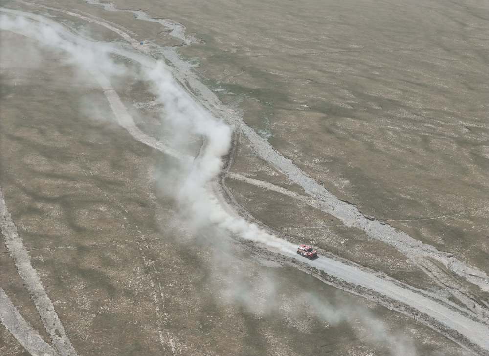 ↑5月31日,新疆八一钢铁车队车手苏来曼·达古提在第九赛段比赛中。新华社记者 辛悦卫 摄