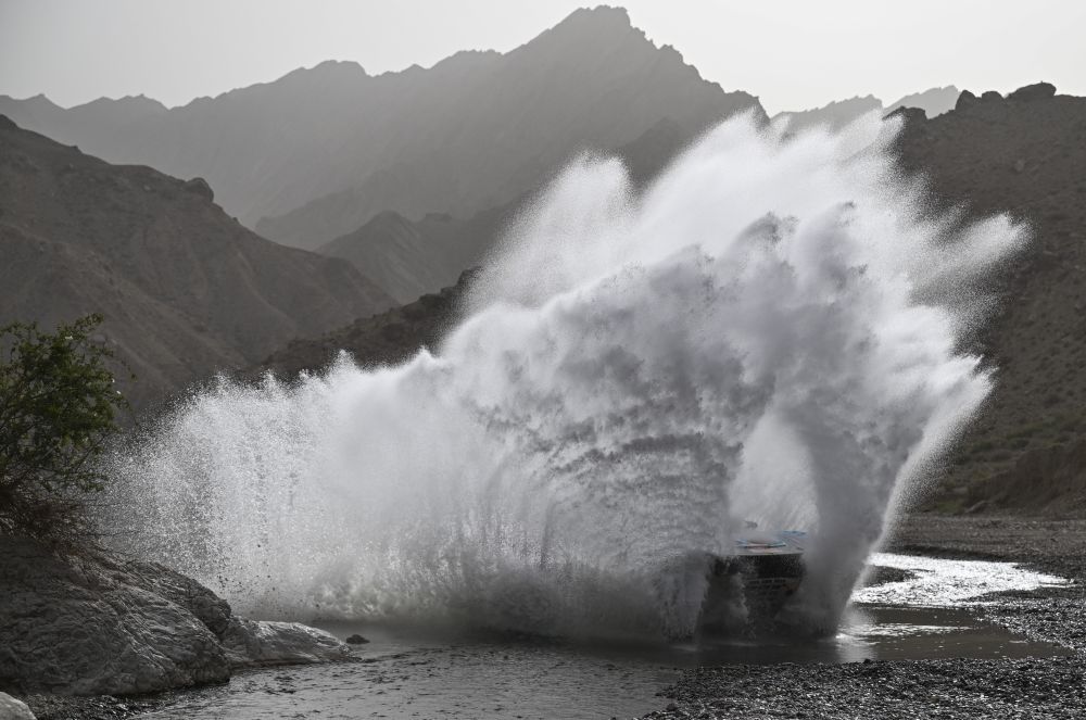 ↑5月23日,赛车在第三赛段比赛中冲过涉水路段。第三赛段比赛在新疆阿克苏地区柯坪县进行,该赛段长330多公里,以狭窄涉水峡谷、戈壁等地形地貌为主。新华社记者 胡虎虎 摄