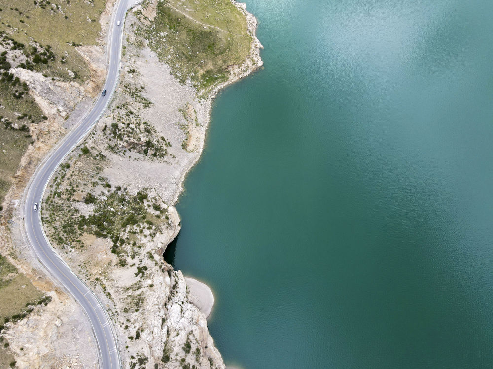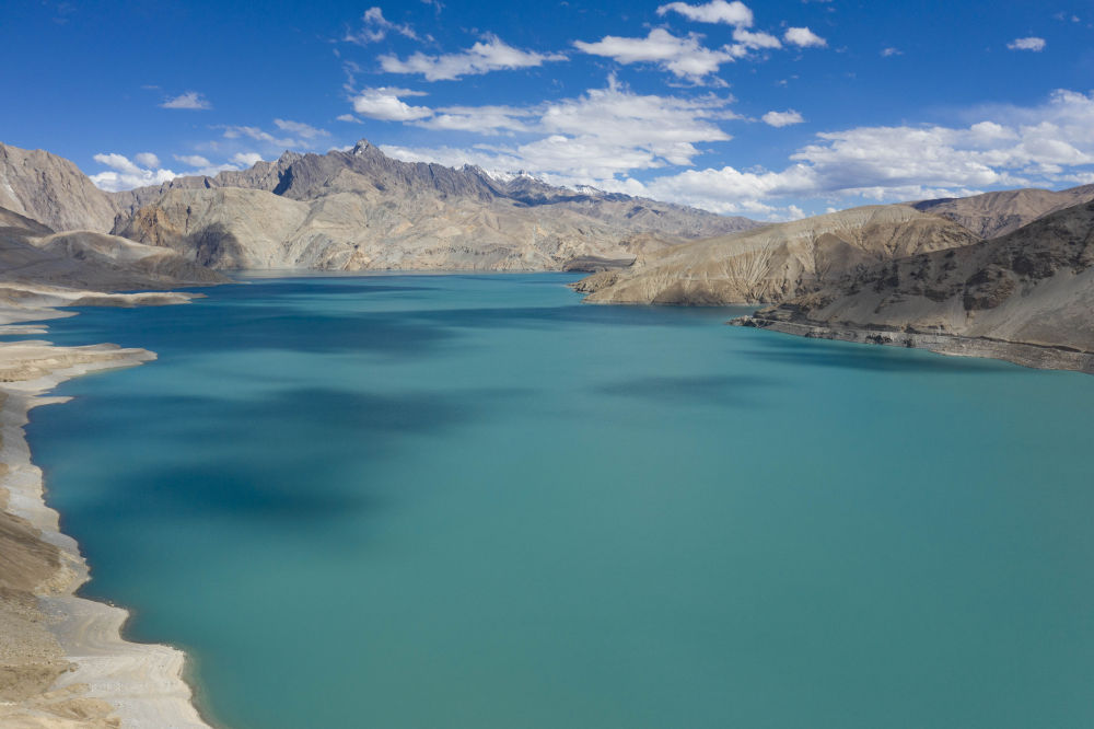 ↑位于新疆塔什库尔干塔吉克自治县的“班迪尔蓝湖”一角(2023年8月28日摄,无人机照片)。新华社记者 胡虎虎 摄