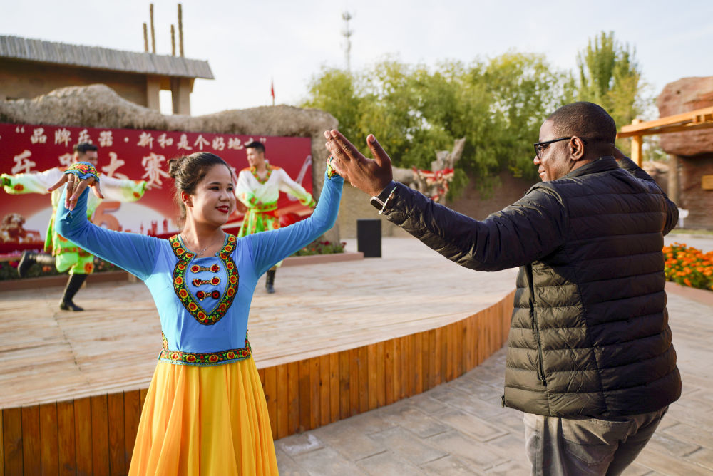 ↑2024年10月15日,第六届世界媒体峰会与会嘉宾在阿克苏地区新和县加依村龟兹文化乐器展示中心与演员互动。新华社记者 陈朔 摄