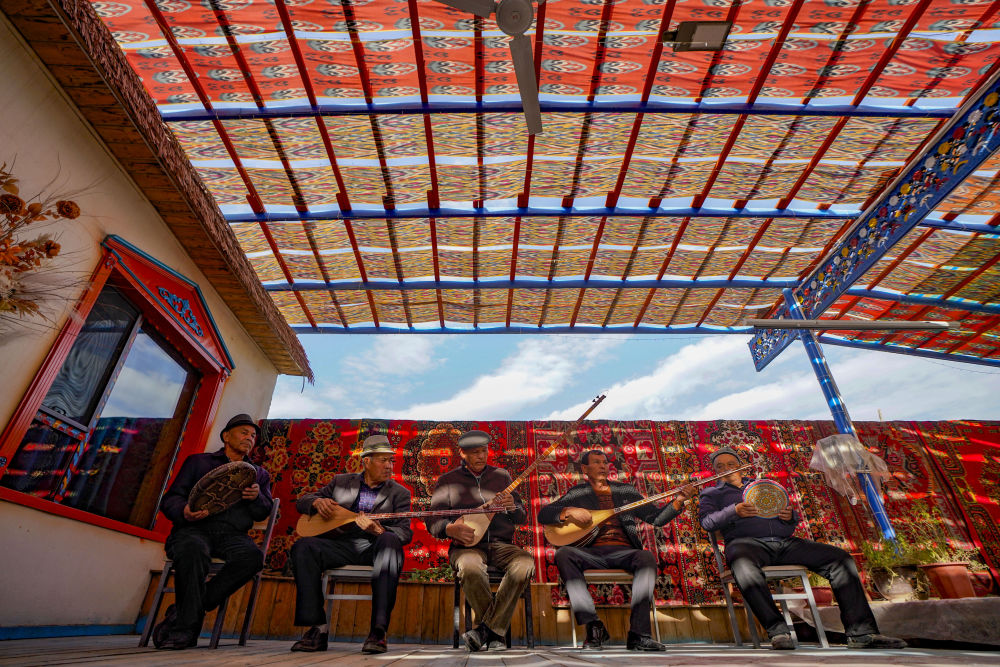 ↑在新疆阿克苏地区新和县加依村,非遗传承人努尔东·司马义(左二)和村民在院子里演奏(2024年10月30日摄)。加依村乐器制作历史悠久,被誉为“新疆民间手工乐器制作第一村”。新华社记者 陈朔 摄