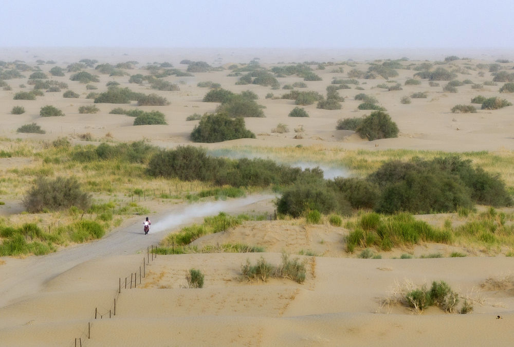 ↑5月26日,一辆摩托车行驶在第五赛段赛道上(无人机照片)。第五赛段全长280多公里,起点设于和田地区洛浦县,终点位于墨玉县。赛道以砾石路、软沙区、沙陇和戈壁混合构成,沿途穿越多片胡杨林,风景壮丽。新华社记者 胡星宇 摄