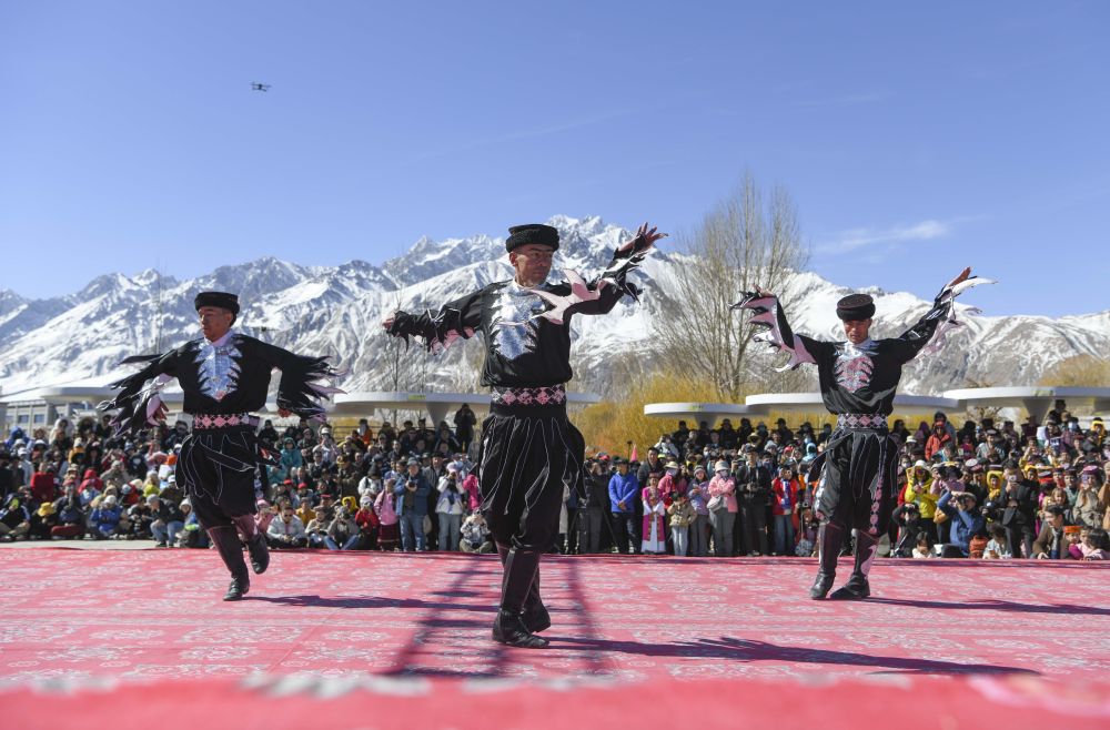 ↑在新疆塔什库尔干塔吉克自治县“彩云人家”民俗村,演员为观众表演国家级非物质文化遗产——鹰舞(2025年3月22日摄)。新华社记者 胡虎虎 摄