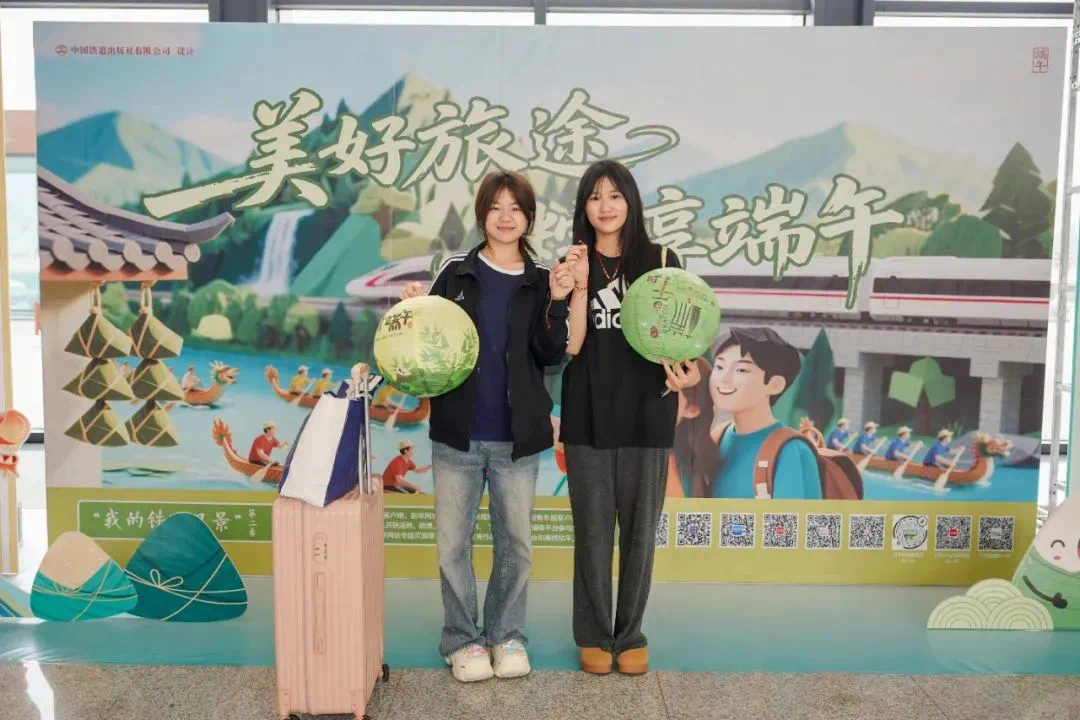 沈阳站在候车大厅、进站通道、售票大厅等醒目位置放置活动宣传海报,特别设置的端午主题打卡专区和极具创意的造型打卡板,吸引旅客们纷纷驻足拍照。