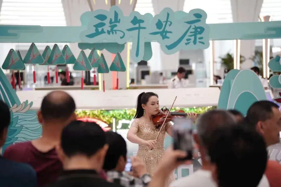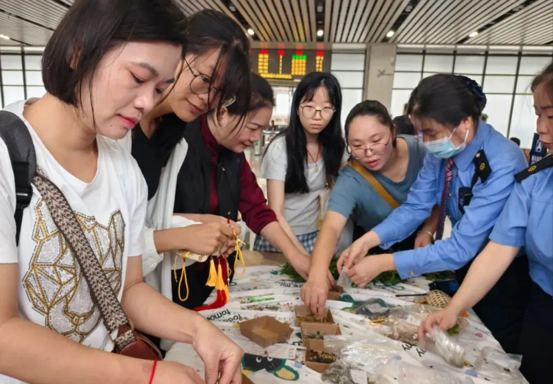 本次活动在车站和列车上设置龙舟打卡点,通过文明出行宣传折页讲解、趣味互动答题、传统文化图书展、制作艾草香包、文艺表演等形式,让旅客沉浸式感受传统非遗文化与铁路优质服务相结合的独特魅力,打造“文化+出行”的节日盛宴。