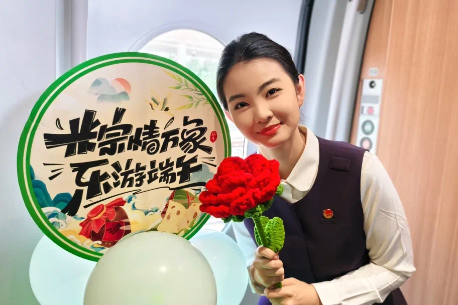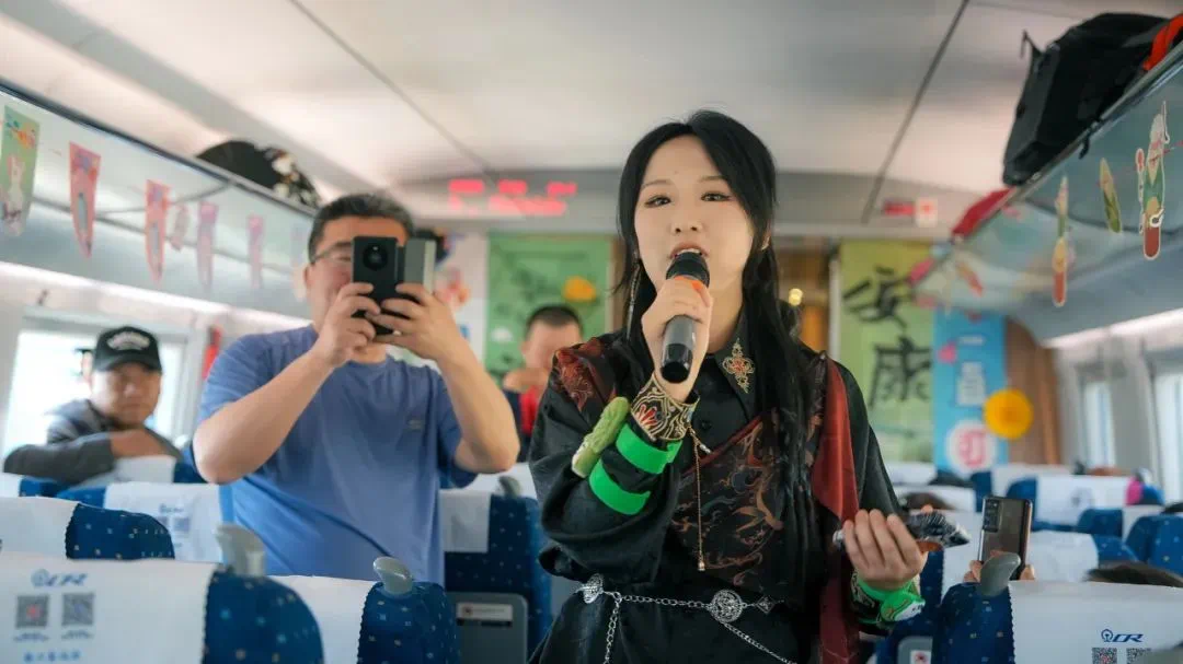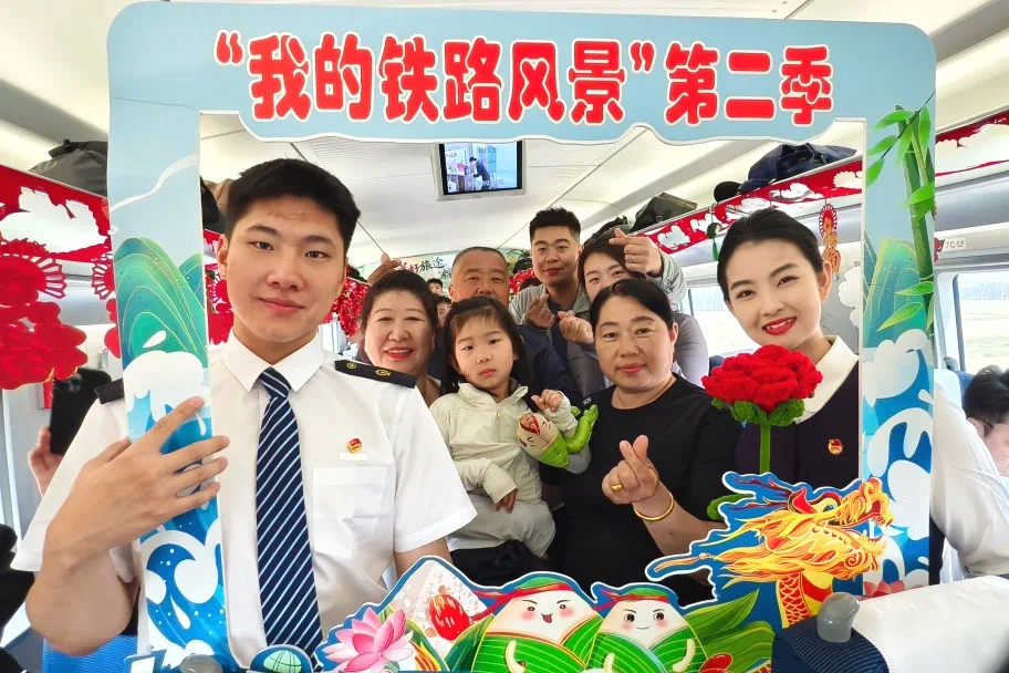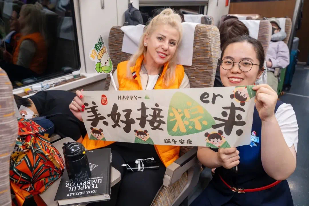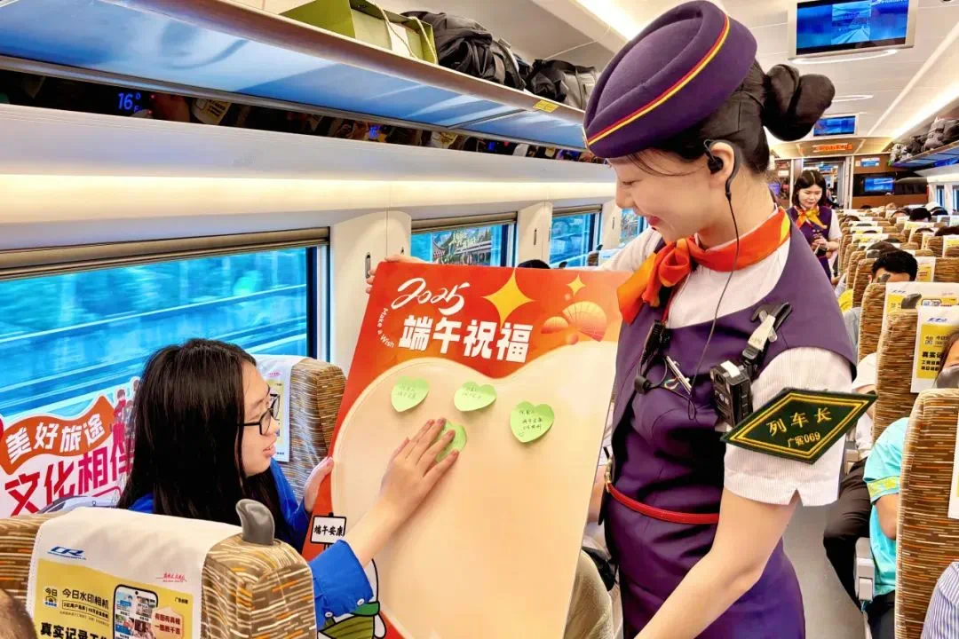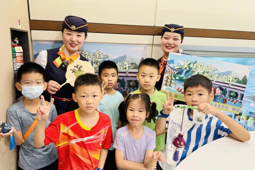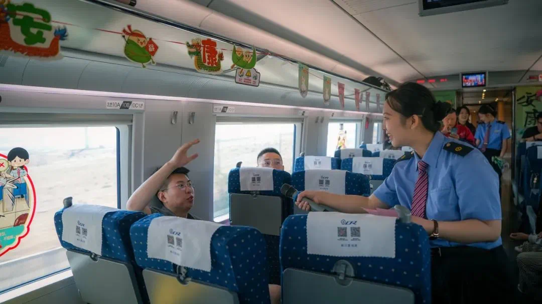 兰州客运段在G2096次列车上为旅客带来甜美的歌曲和精美的节日纪念品,并与旅客开展趣味问答、历史讲解、“端午”主题游戏、文化体验等多种形式的互动,让高铁旅程成为感知中华优秀传统文化的流动课堂。
