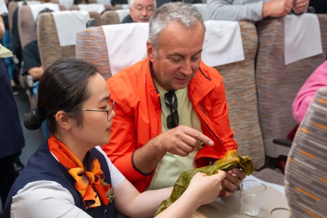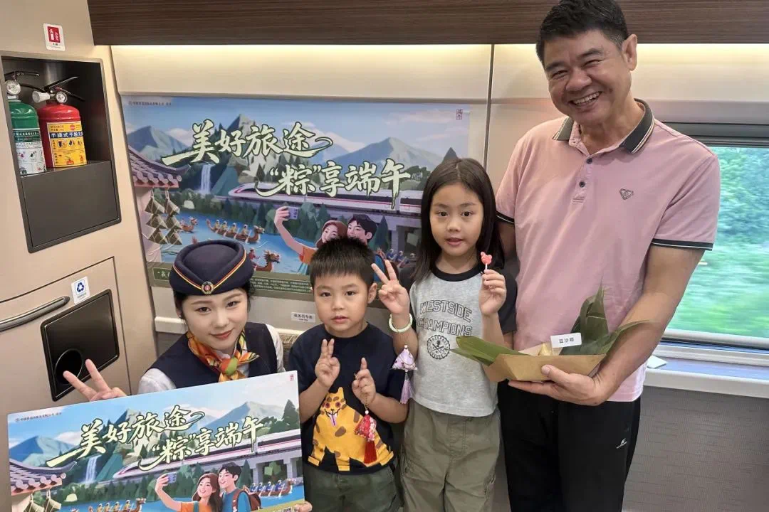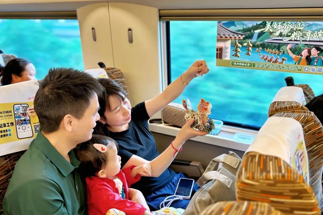 车厢内粽香四溢,窗花与香囊点缀其间,旅客在互动中体验传统习俗的温情,沉浸式感受节日氛围。旅客王女士说:“没想到在高铁列车上还能过端午节,又能看表演、还能做游戏,体验制作五彩绳和香包,真的是一次不一样的旅途。”