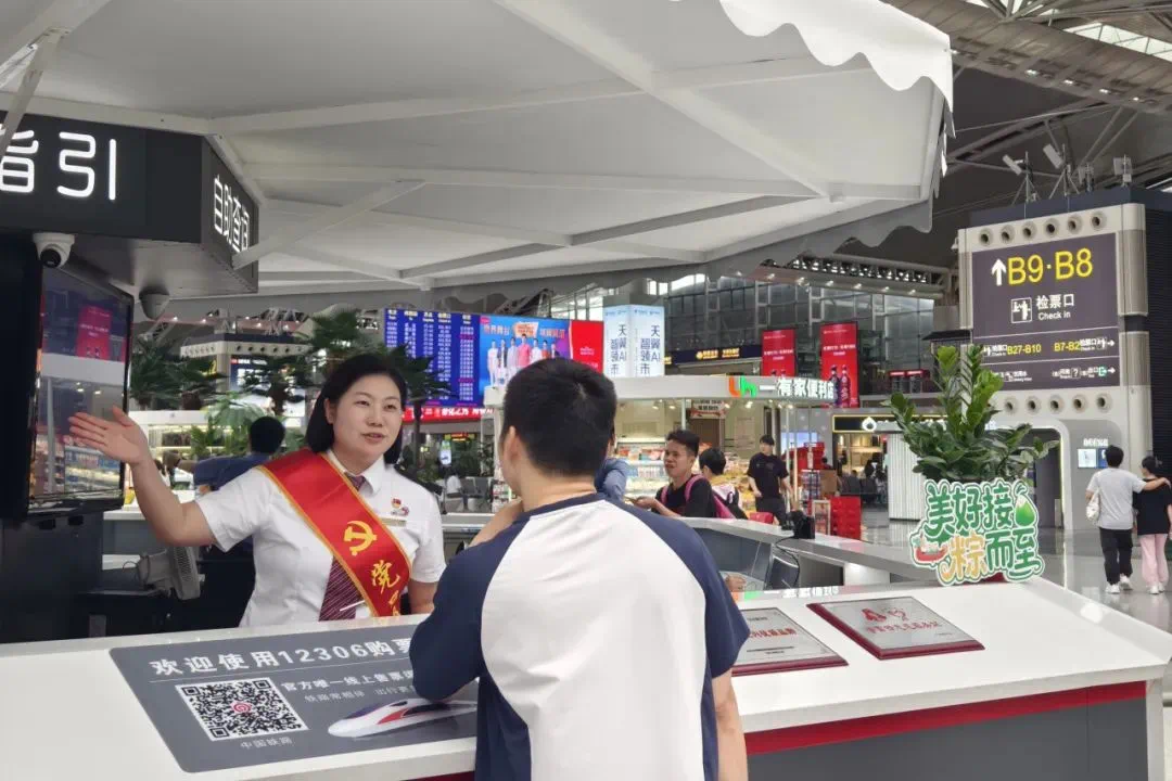 中卫站开展“美好旅途 ‘粽’享端午”文化互动活动,向旅客送去粽子、香囊、七彩手链,为旅客讲解出行小常识、购票攻略和旅客积分兑换方法等,营造旅客温馨出行、平安出行的浓厚氛围。