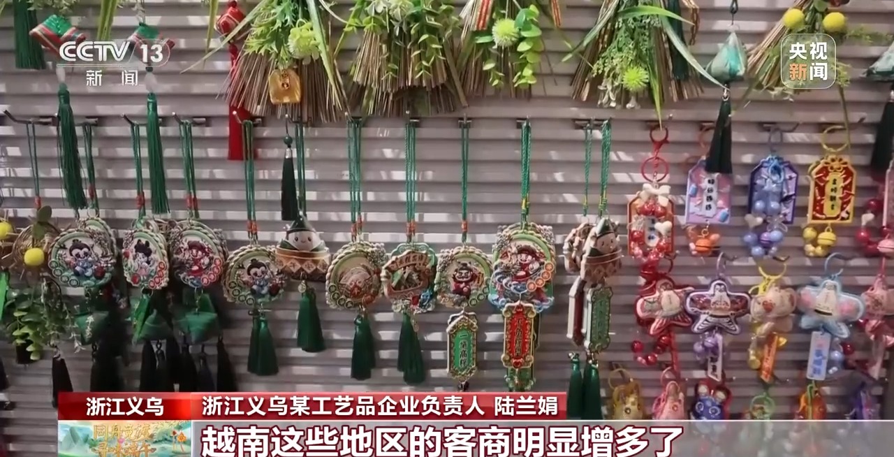 浙江义乌某工艺品企业负责人 陆兰娟:以前香囊的消费群体以国内为主,这两年,越来越多的外国客商来咨询。前年卖出了15万个左右,去年订单翻了一番,有30万个。那今年的订单也明显超过了过去,尤其是新加坡、马来西亚、越南这些地区的客商明显增多。