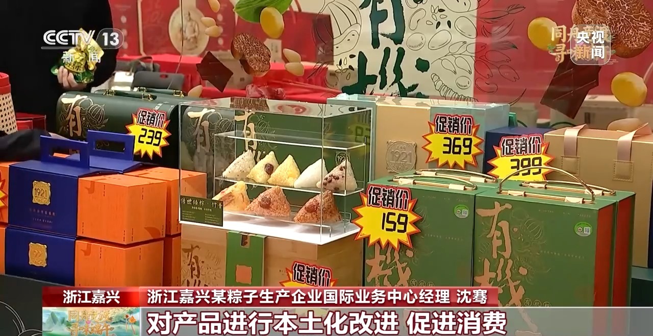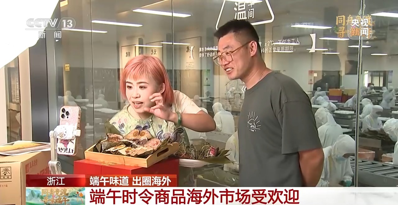 浙江嘉兴某粽子生产企业国际业务中心经理 沈骞:我们在直播中会展示粽子制作过程、食品溯源以及科普习俗,让国外消费者了解粽子文化。我们还积极参加一些国内外的展会,结合当地文化和消费习惯,对产品进行本土化改进,促进消费。今年,我们的粽子出口到了柬埔寨的商超和网购平台,在韩国大枣粽和豆沙粽非常受欢迎。
