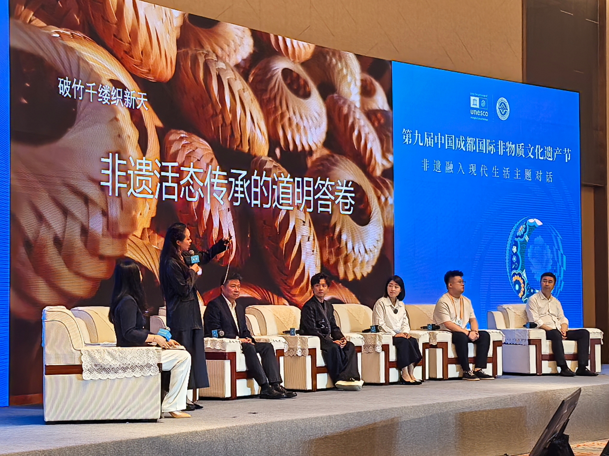 5月29日,在第九届中国成都国际非物质文化遗产节“非遗融入现代生活”主题对话现场,道明竹编省级非遗代表性传承人杨隆梅拿出一片薄如蝉翼的竹篾,“大家看到了吗?这是我们团队在竹编工艺的技术突破,成功将竹篾剖至28层。”这意味着竹篾可以编织出更加细腻、精致的图案和造型,极大地拓展了竹编艺术的表现空间。