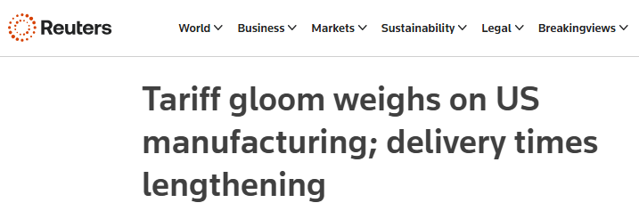 路透社近日的一篇报道认为,美国制造业5月连续第三个月萎缩,在关税影响下,供应商交付投入的时间是近三年来最长的,这可能预示着某些商品即将出现短缺。
