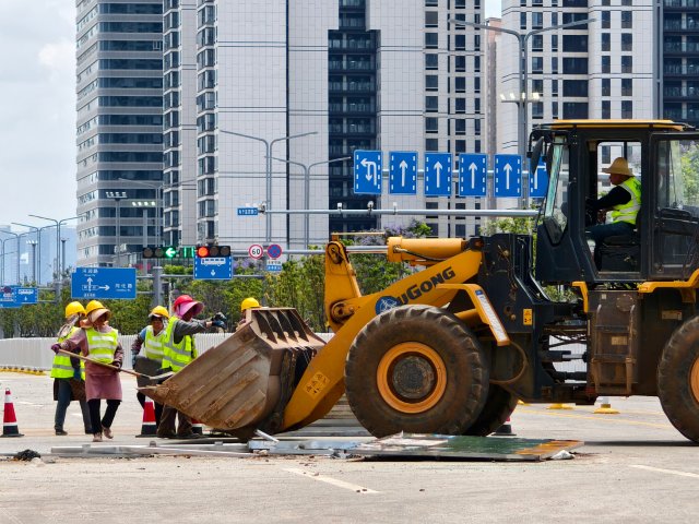 工人们或推、或拉、或撬,在机械的配合下,围挡构件被有序归置——这是通车前“最后一公里”攻坚的“微观切片”。