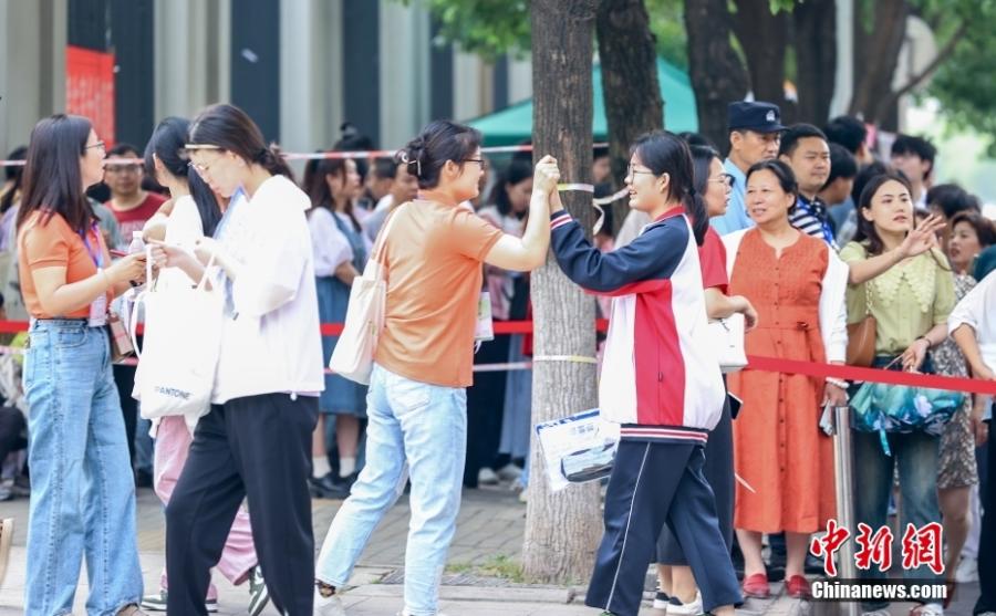资料图:2024年6月7日,湖北省武汉市长虹中学考点,考生入场前与送考老师击掌。张畅 摄