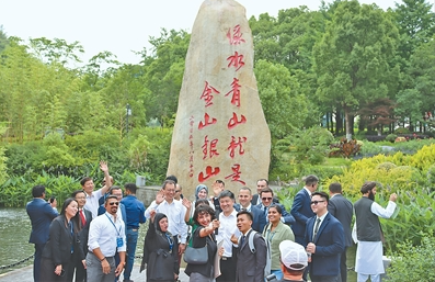 参加上海合作组织青年“感知共富路”活动的中外人员在余村合影留念。本报记者 李安琪摄