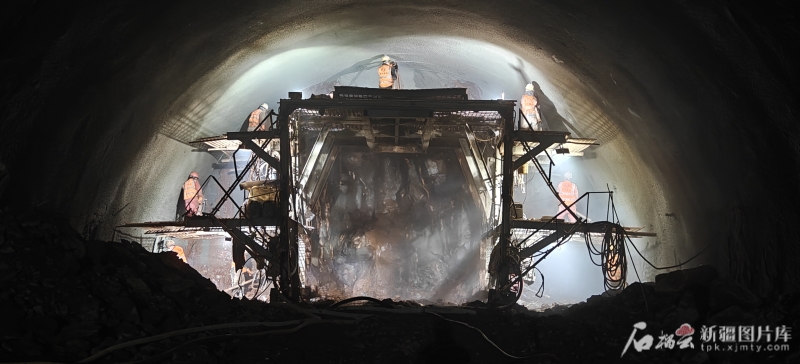 国道218线那拉提至巴仑台公路项目艾肯隧道内,挖掘机长臂挥舞、装载机来回穿梭,建设者身着反光背心、头戴安全帽,在各自岗位上紧张有序地忙碌着。