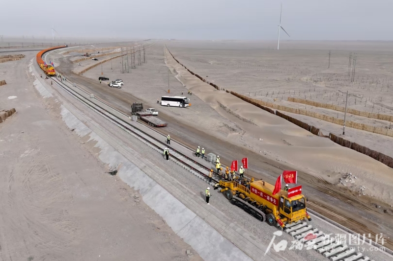 罗布泊至若羌铁路(以下简称“罗若铁路”)米兰至罗布泊段铺轨现场,铺轨机把一段500米长的钢轨平稳落入钢轨槽中,新疆环线的最后一条铁路——罗若铁路铺轨工程稳步推进。