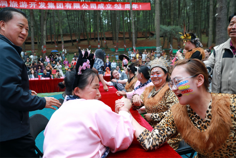 本次活动还安排了丰富多样的节目。西游文化、野人文化农耕走秀,生动展现了景区独特的文化魅力;斗鸡比赛、男女掰手腕擂台赛、成语接龙等互动环节,让现场观众热情高涨;男子团体拔河赛则充分体现了团队协作的力量;而大草坪晚宴和烟花秀更是将庆典氛围推向了高潮,大家在欢乐的氛围中共同庆祝集团23岁生日。