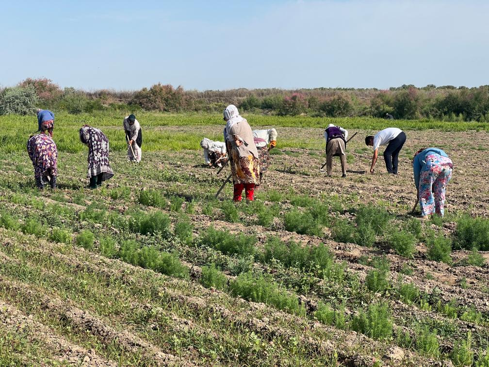 6月3日,位于乌兹别克斯坦穆伊纳克镇的咸海国际创新中心的试验示范园区内,当地农户在与中国科学院新疆生态与地理研究所合作共建的“光伏+生态”盐生植物园里劳作。(受访者供图)