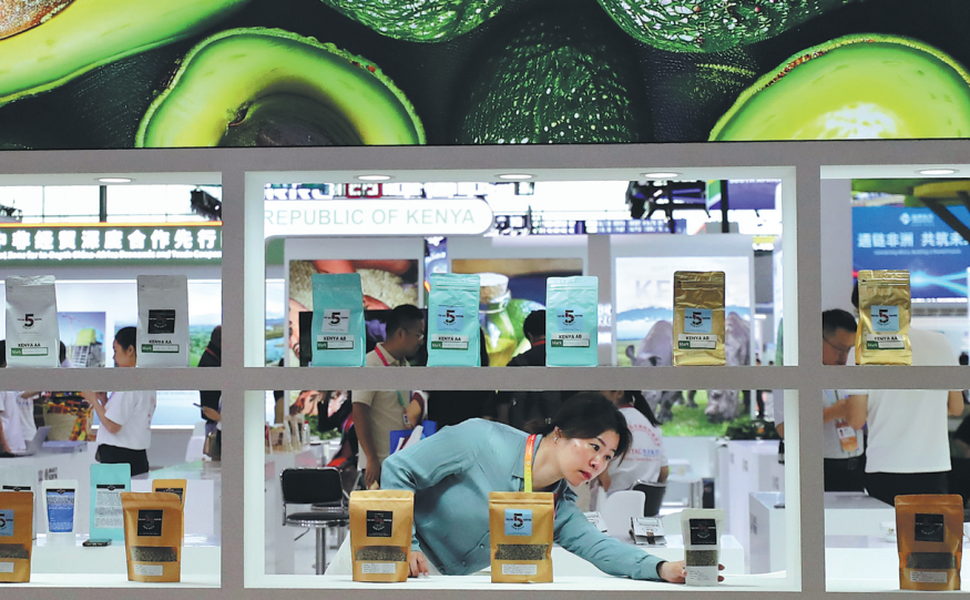An exhibitor arranges coffee products on show during a China-Africa trade expo in Changsha, Hunan province. ZHANG WEI/CHINA DAILY