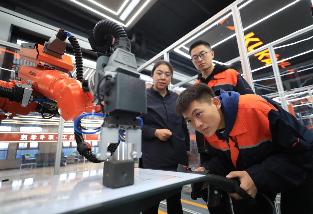 2024年11月22日,沈阳工学院电气工程及自动化专业学生操作机器人进行物料码垛实训。近年来,沈阳以产业需求为导向,促进技术院校与知名企业共建高水平新型工业化实践教学中心,构建校企协同合作推进产教深度融合,促进学生高质量就业。新华社记者 杨青 摄