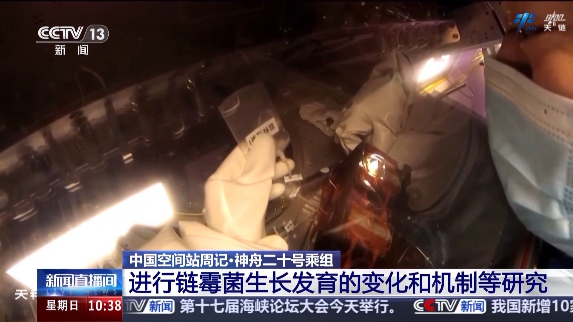 在生物技术实验柜内,“空间微重力对微生物的效应机制研究”持续推进,在空间微重力环境下,航天员进行了链霉菌的生长、发育分化、生物活性物质合成、种群传代演替的变化和机制等研究。利用科学手套箱,航天员完成了液体培养样品采集工作,并将其冷冻保存,等待下行。在空间微重力物理领域,乘组完成了燃烧柜实验插件采样盖更换,无容器柜清洁维护等工作。