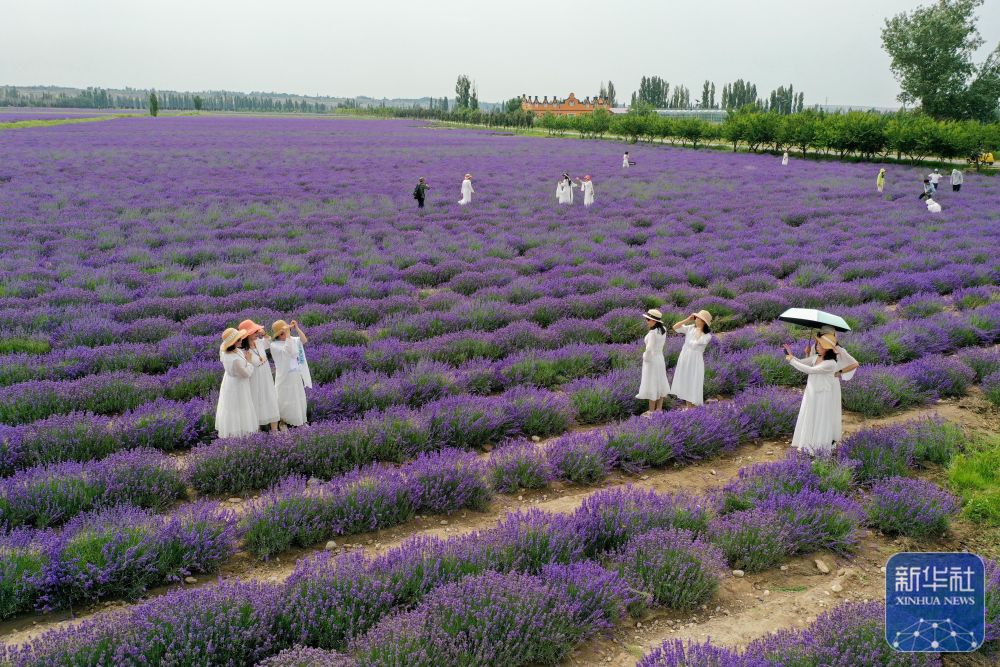游客在新疆伊犁哈萨克自治州霍城县解忧公主薰衣草农场游玩(6月14日摄,无人机照片)。新华社记者 丁磊 摄