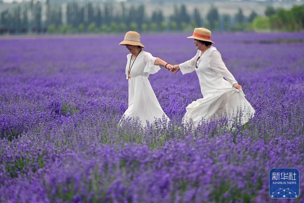 游客在新疆伊犁哈萨克自治州霍城县解忧公主薰衣草农场游玩(6月14日摄)。