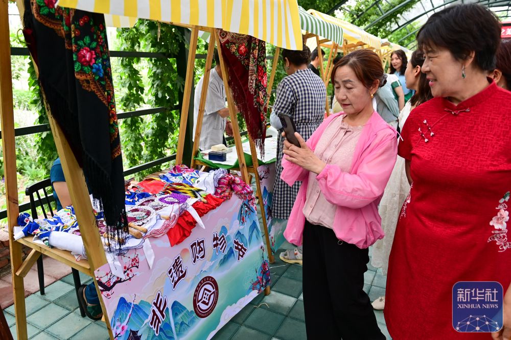 在新疆伊犁哈萨克自治州霍城县解忧公主薰衣草园,游客在非遗集市游览拍照(6月14日摄)。