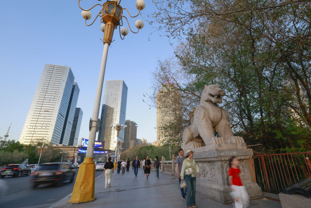 市民从乌鲁木齐市中心地标性建筑西大桥上的石刻虎头狮纹兽旁走过(2025年5月9日摄)。新华社记者 王菲 摄