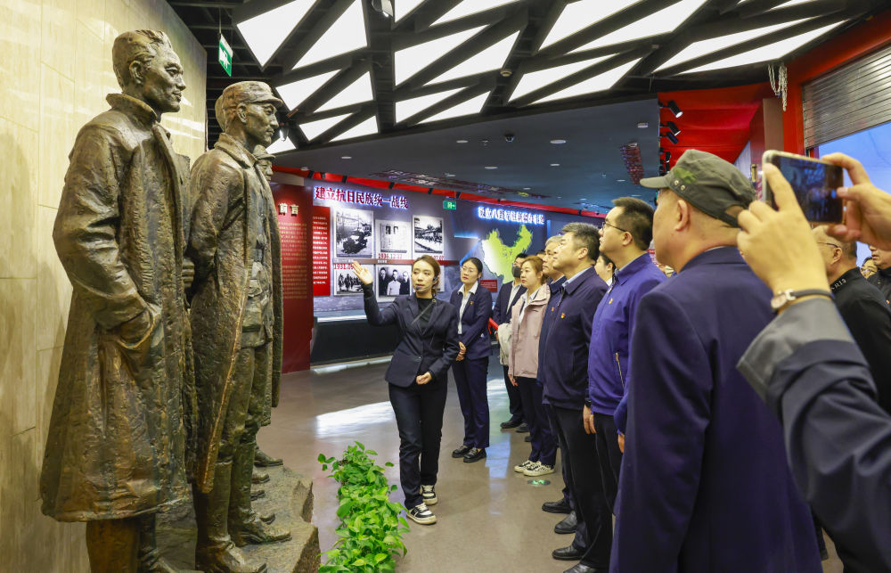 在八路军驻新疆办事处纪念馆,讲解员卢臻(左一)为参观者讲解(2025年4月15日摄)。新华社记者 王菲 摄