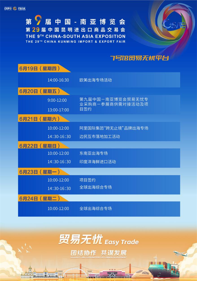6月19日至24日,第9届中国—南亚博览会暨第29届中国昆明进出口商品交易会将在昆明滇池国际会展中心启幕。7号馆贸易无忧平台全面升级、亮点纷呈。