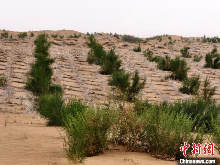 夏日骄阳炙烤着九棵树治沙项目区,广袤的沙地上,一排排整齐的草方格如同给沙丘上了“锁链”,而这些被固定住的流沙,为植被生长创造了重要条件。